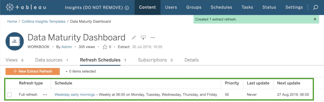 Tip In the Refresh Schedules tab, you can see the refresh schedule event you configured.
