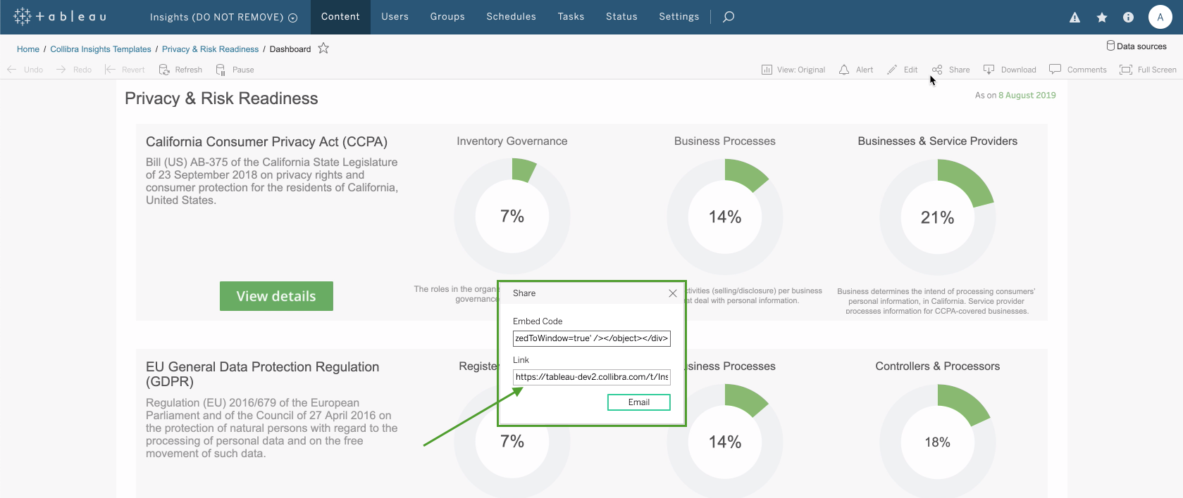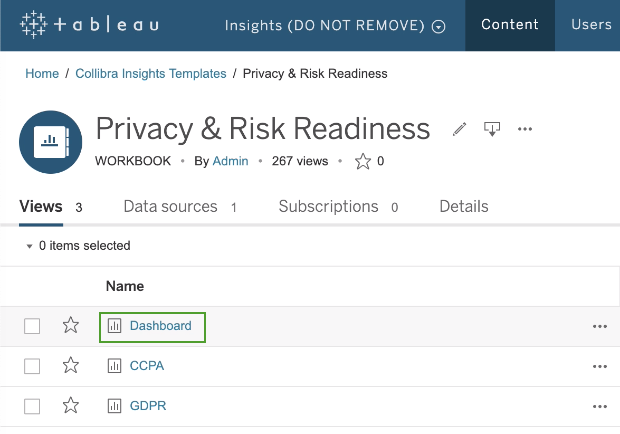 - On the Workbooks tab in Tableau, click one of the workbook files, for example Privacy & Risk Readiness.
