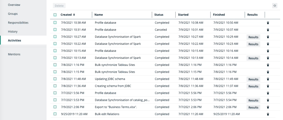 If available, a button to see the result of the activity. Depending on the activity, the result can be different. Example If you exported assets and click Results in the Activities list, you download the export results. If you registered a data source in Data Catalog, a dialog box shows more information about the registration job. |