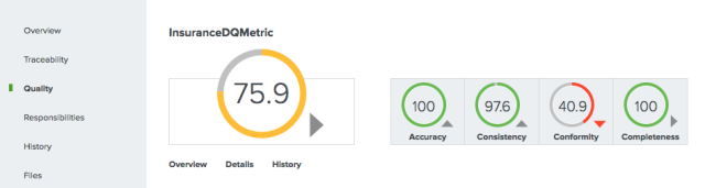 The first ring chart shows the general score of the asset. The ring charts next to it show subscores for a specific dimension, such as Accuracy, Conformity, Completeness and Consistency. Only values that belong to that specific dimension are then taken into account. The dimensions to use are configured in the metric group. In this example, it is the relation: Data Quality Rule is Classified By Data Quality Dimension.