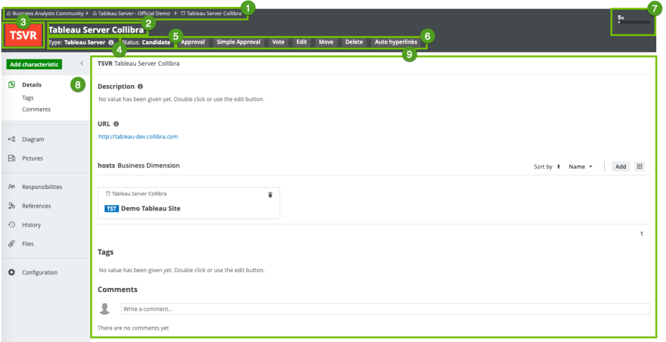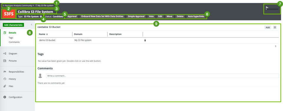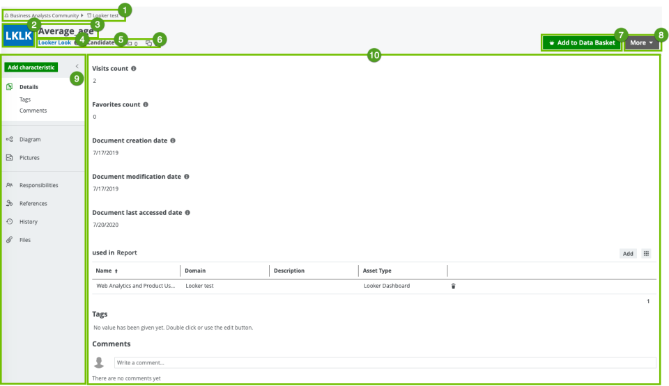 The Details tab page contains information about the attributes or relations of the asset. It also contains tags and comments. |