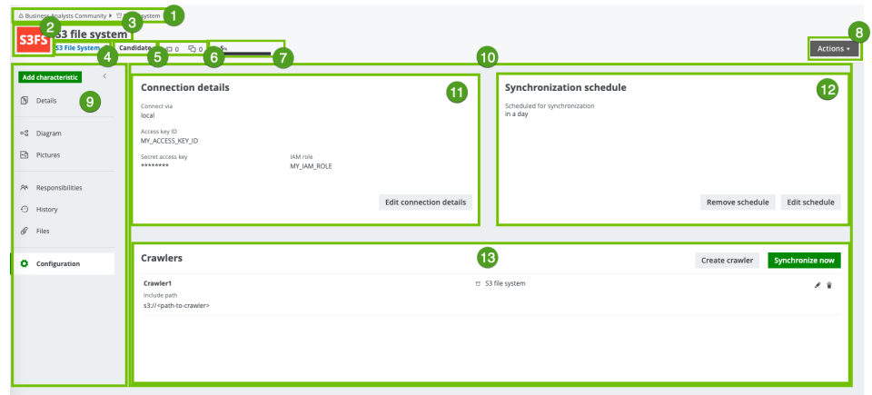 The currently selected page, in this case the Configuration page, which contains the Connection details section, the Synchronization section and Crawlers section of the S3 File System asset. |