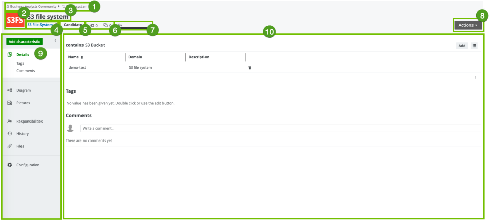 The Details tab page contains information about the attributes from the Summary tab page and the attributes or relations that the user adds to the asset. It also contains tags and comments. |