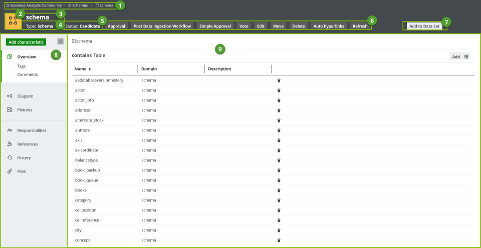 A collapsible pane that allows you to navigate to other pages of the Note You only see the Technical lineage tab if you have ingested Looker metadata (cloud-only feature) and you have the Data Catalog and Technical lineage global permission. |
