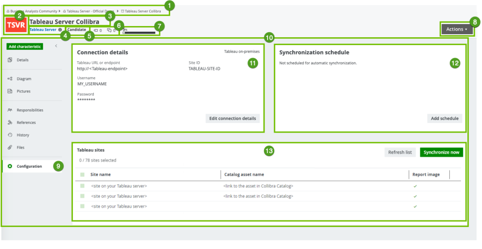 The currently selected page, in this case the Configuration page, which contains the Connection details section, the Synchronization section and Tableau sites found on server section of the Tableau Server asset. |