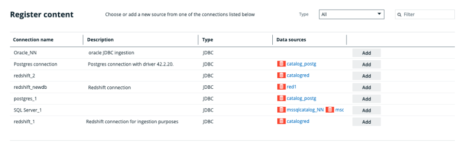 The Register content page shows the data sources that are connected to Data Catalog via Edge. From this page, you can register the data sources to create assets that represent the content of these data sources.