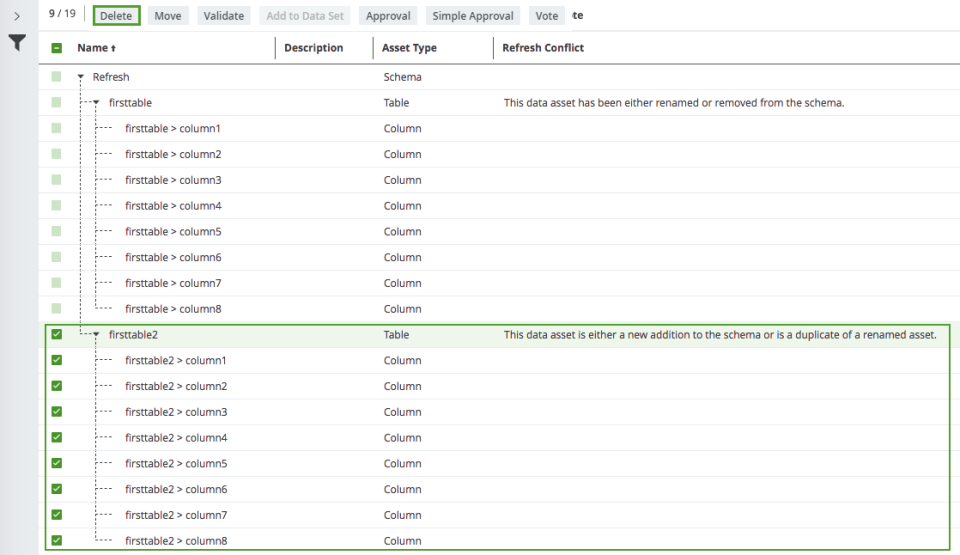 In the following example, the original schema Refresh contains the table firsttable. This table has been renamed to firsttable2. After refreshing the schema, refresh conflicts appear, as shown in the following image: