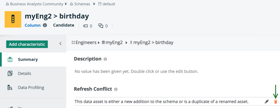 The column asset page appear. - In the Refresh Conflict section of the column asset page, hover over the message and click