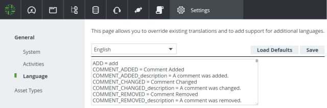 ), click Load Defaults to fill the editor with the default English UI text. - Edit or translate the interface text, or paste the content from your translation file.