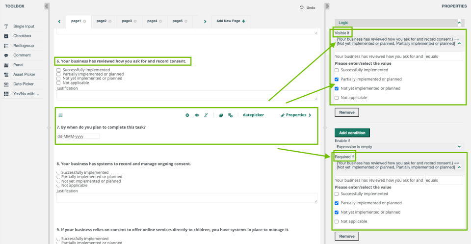 For each question or page in a template, you can configure logic, whereby if certain conditions are met, a specified action occurs.