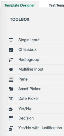 In the Template Designer tab, the toolbox contains various question types, such as Single input, Yes/No and Checkbox. You use these question types to add questions and statements to the building area, to elicit input from the user conducting an assessment.