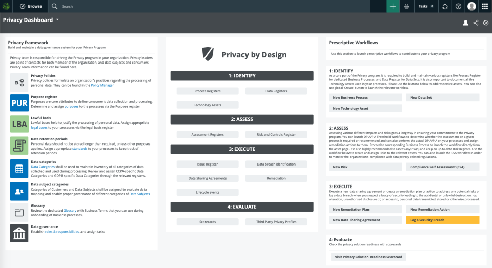 - Log a Security Breach: to log a potential breach of security that could lead to the accidental or unlawful destruction, loss, alteration, unauthorized disclosure of, or access to, personal data.