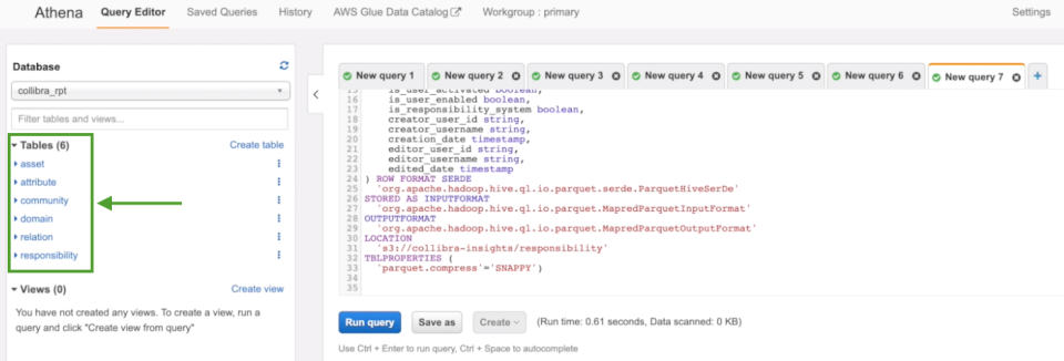 - In the Reporting Data Layer ZIP file you downloaded from Collibra Marketplace, drag and drop the first SQL file into a new query tab.