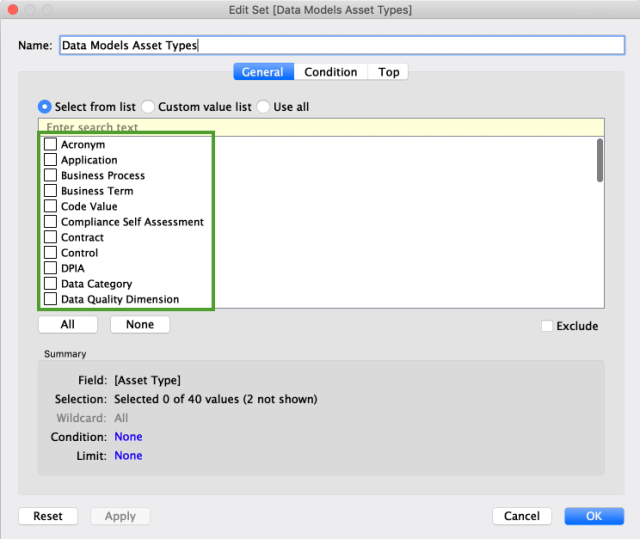 The Edit Set dialog box appears; however, no asset types are selected.