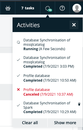 Activities shows a list of the most recent or ongoing activities in Collibra Data Intelligence Cloud. Every time you start a new activity, it is shown in the Activities list.