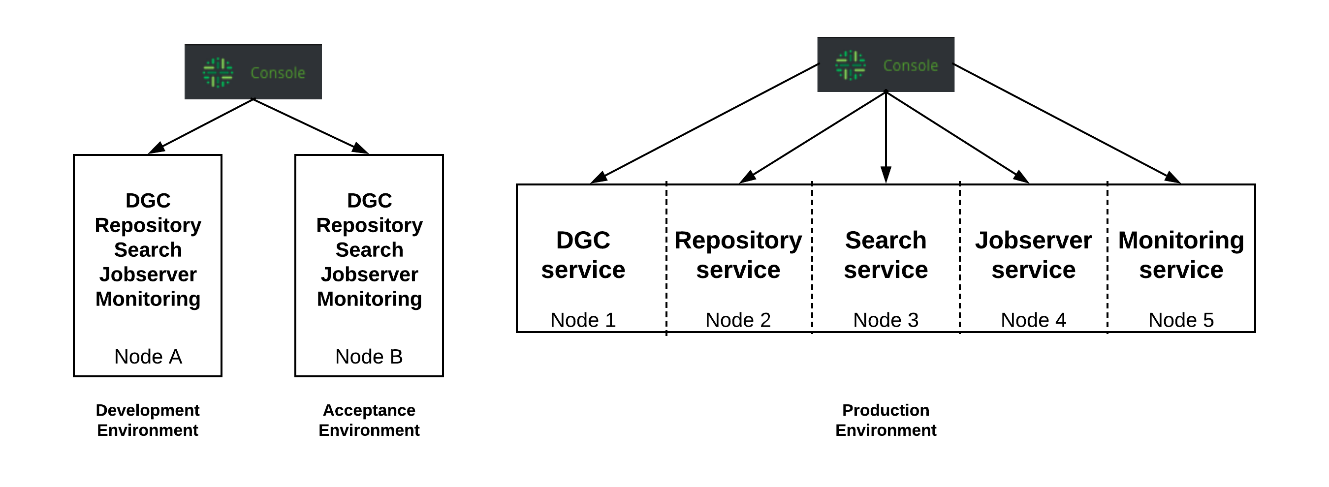 In the schema, you see that in the development and acceptance environment, all services run on the same node. In the production environment, the services run on separate nodes. You can also run Collibra Console on a separate node, which is recommended, but you can also choose to run it on a node in combination with one of the services