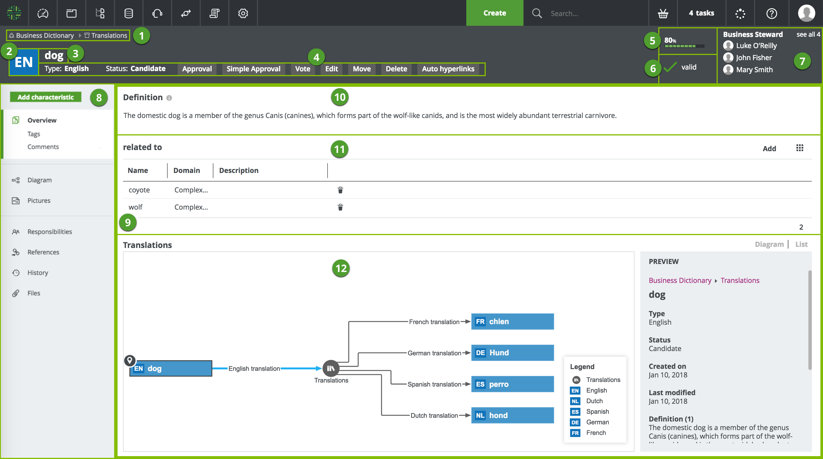 The currently selected page, in this case the Overview page, which contains all the attributes If a certain attribute type has been assigned as mandatory for this asset type, this attribute is shown in the asset's Overview tab, even if no attribute value has been defined yet. Tip If you want to copy and paste text from other sources into a text field, we recommend that you click |