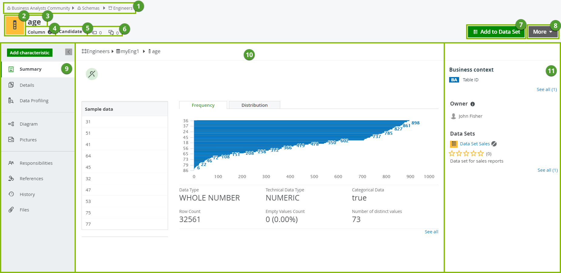 The Summary tab page contains a short, read-only overview with some sample data. Tip You can also quickly see whether the column contains personal information |