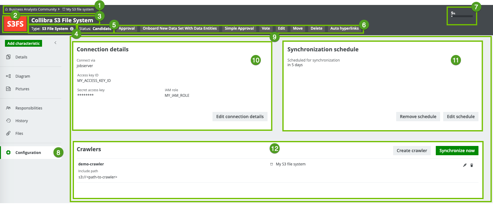 The currently selected page, in this case the Configuration page, which contains the Connection details section, the Synchronization section and Crawlers section of the S3 File System asset. |