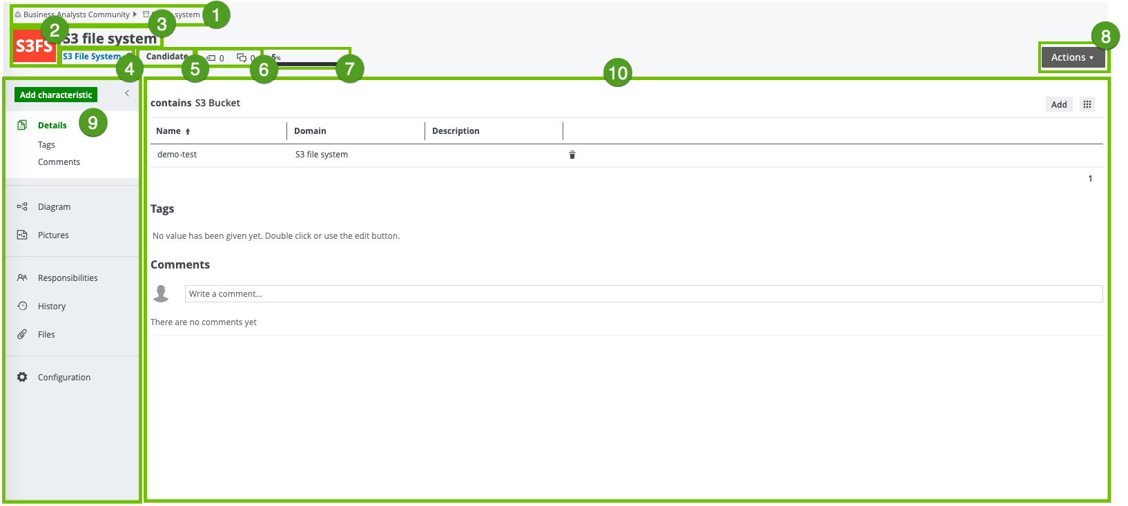 The Details tab page contains information about the attributes from the Summary tab page and the attributes or relations that the user adds to the asset. It also contains tags and comments. |