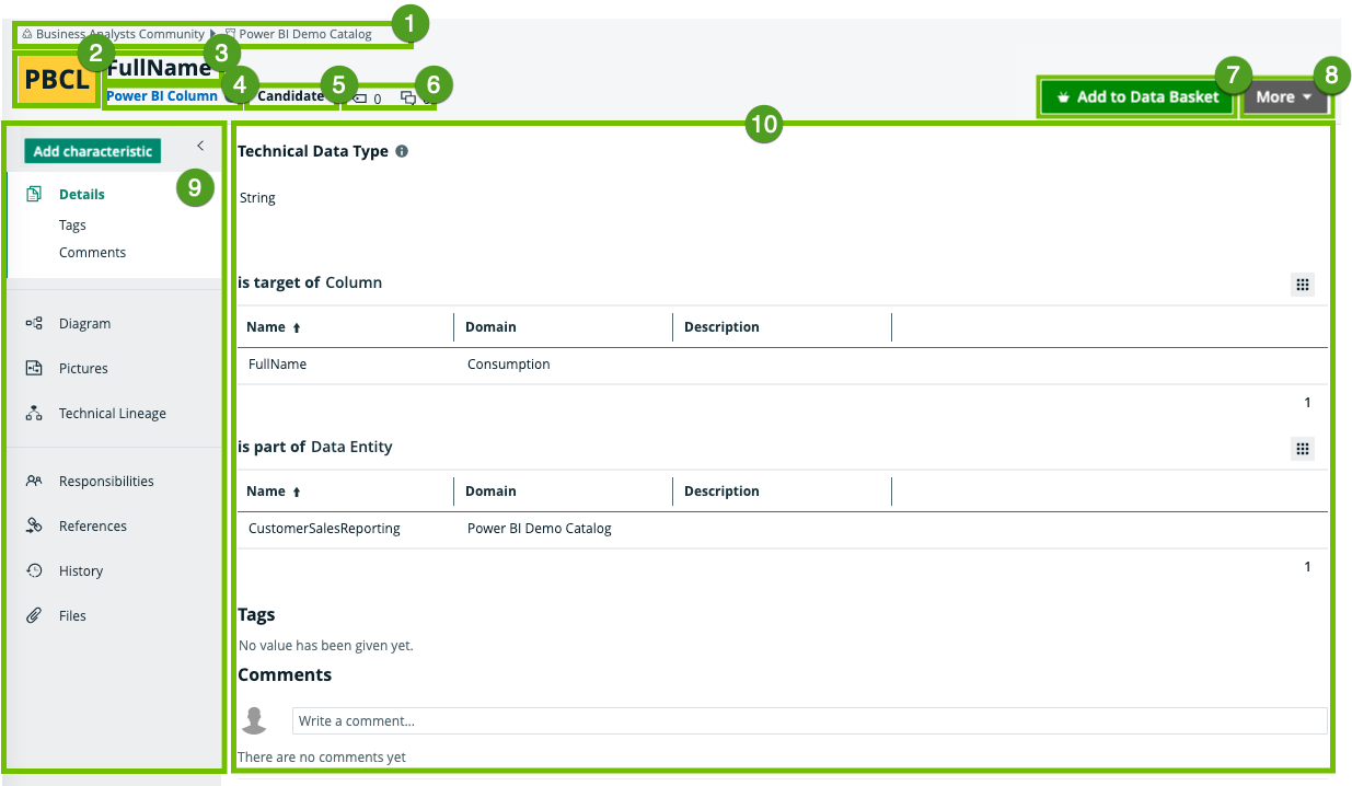 A collapsible pane that allows you to navigate to other pages of the Note You only see the Technical lineage tab if you have ingested Power BI metadata (cloud-only feature) and you have the Data Catalog and Technical lineage global permission. |