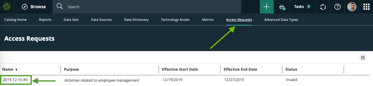 - A Data Usage asset is created in Collibra Data Intelligence Cloud. You can view all your requests and their current status on the Access Requests page.