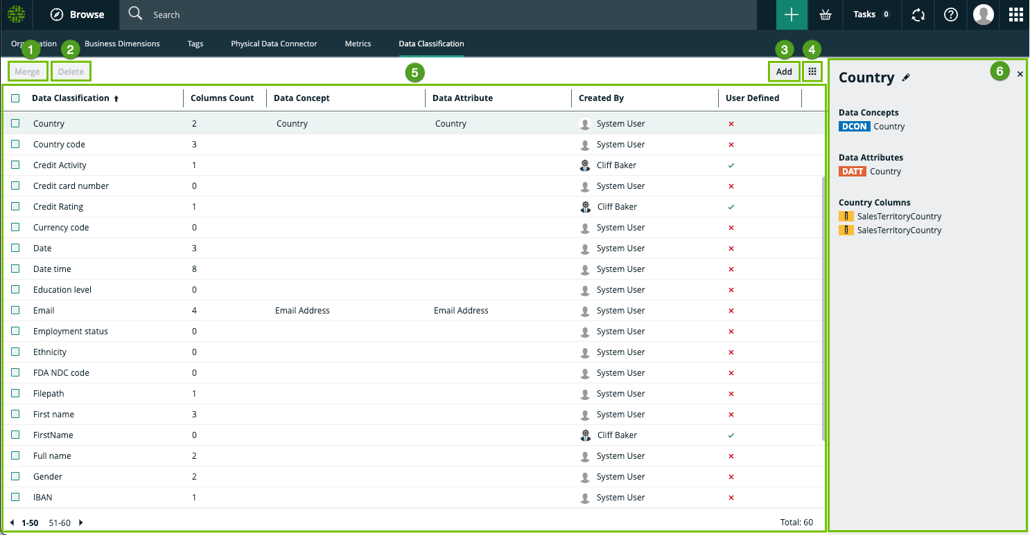 The Data Classification Dashboard shows the list of data classes in your Collibra environment and gives you more control and visibility on them. When you make changes via the Data Classification Dashboard, feedback is automatically sent to the Data Classification platform.