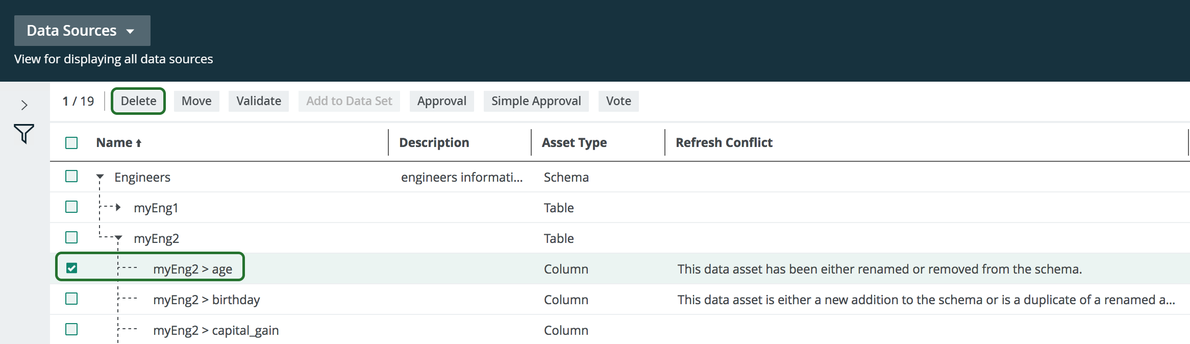 If necessary, select all column assets that are removed from the data source. - Above the table click Delete.
