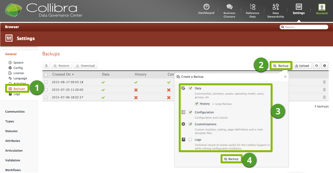 - In Collibra DGC, click Settings → General → Backups.