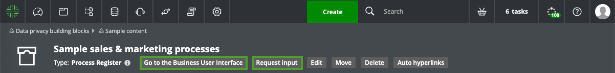 These domains include sample Business Process assets, to give you a head-start in identifying your business processes, their characteristics and related elements. You can edit these assets, move them to other Process Register domains and invite Business Stewards, Data Stewards and Privacy Stewards, to further develop them.