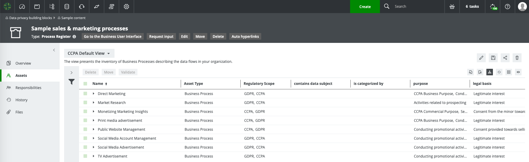 Collibra Data Privacy comes with four packaged sample Process Register domains.