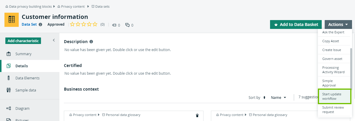 Any Business Steward can start this workflow by clicking Start update workflow on the asset page of the relevant approved asset.