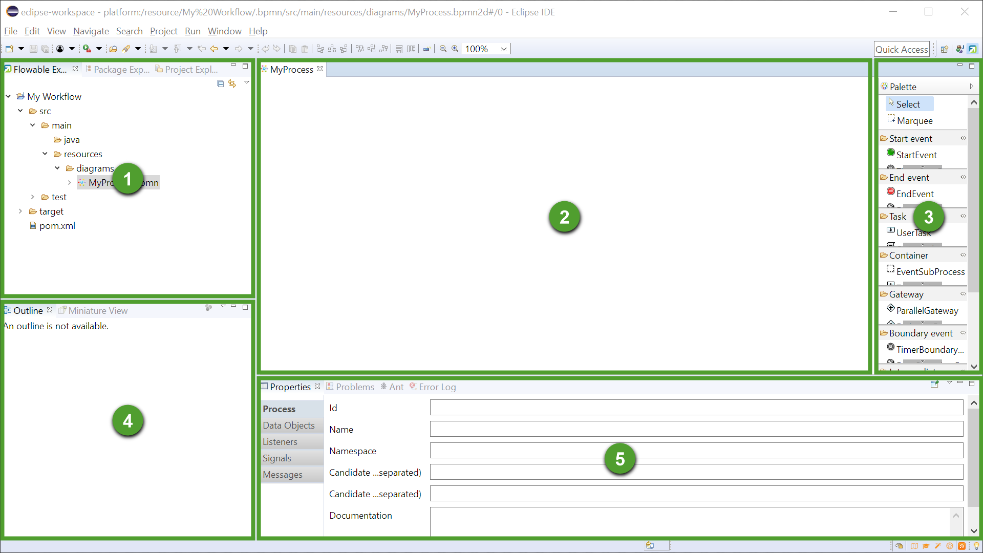 Open Eclipse IDE and make switch to the Flowable perspective to optimize the workbench for designing diagrams: