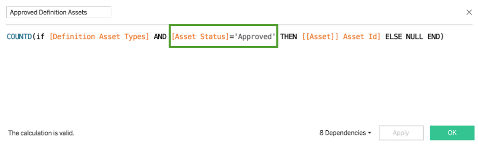 - In the calculation logic, change the asset status from "Approved" to the status you want, for example "Accepted".