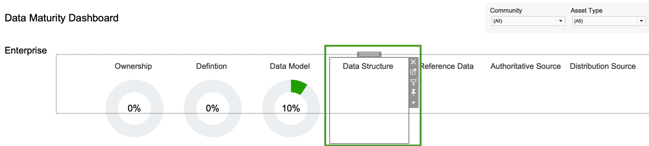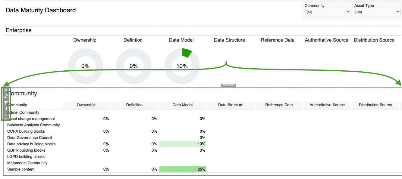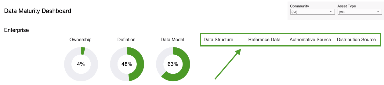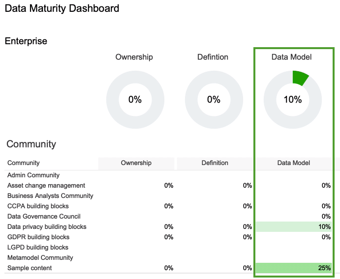 Note Keep in mind that the formula for calculating the percentage entails a division operation involving the number of assets with the status Approved. - On the Dashboard tab, the progress circle chart is now shown for the Data Model metric.