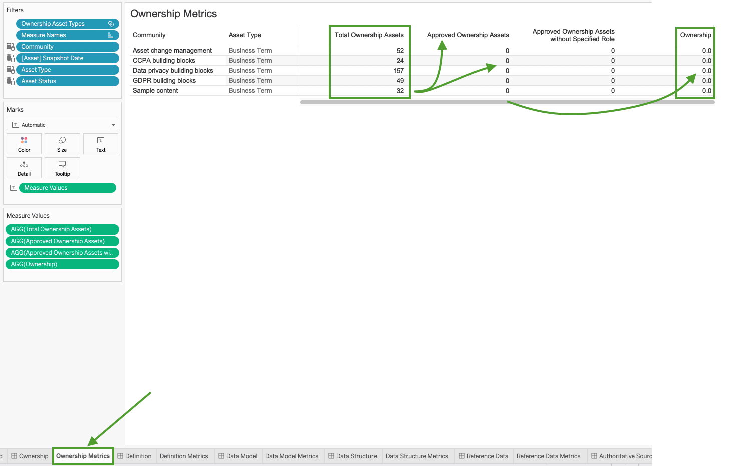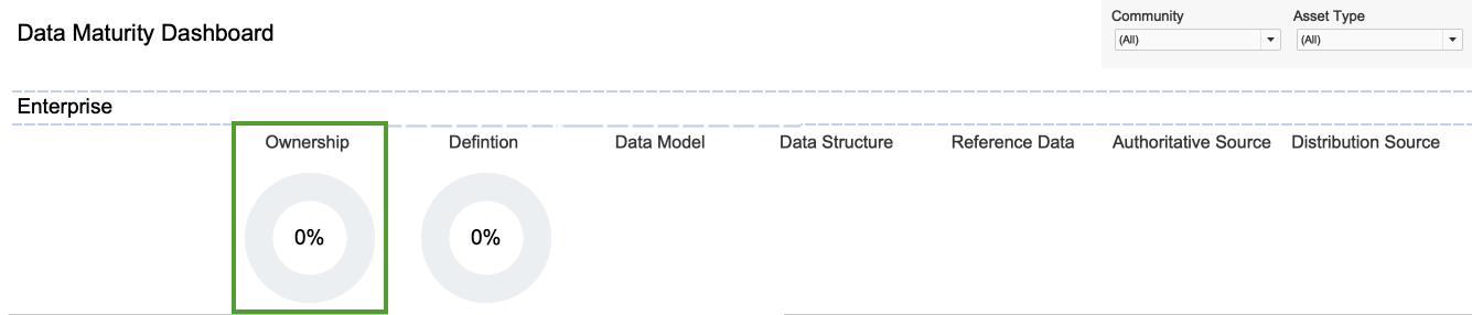 If you go to the Ownership Metrics tab, you see that there are many Business Term assets for inclusion in the report. One might expect that the presence of these assets would be reflected in the circle chart. However, the formula for calculating the percentage entails a division operation involving the number of assets with the status Approved. In this example, there are no assets that have the status Approved, and this "0" value results in an Ownership percentage of 0%.