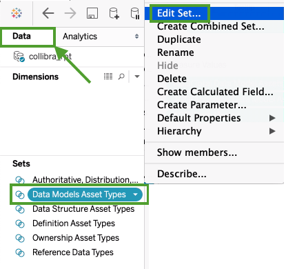 - In the Data tab, select Data Models Asset Types, and then select Edit Set.