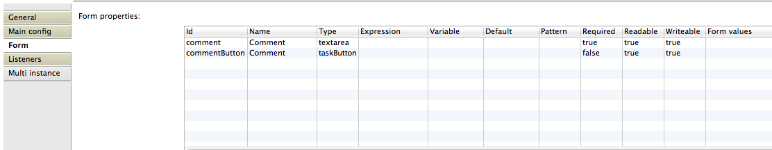 - A regular form property of the type of the type taskButton, so it contains a Comment button that submits the entered value to the workflow and completes the task.