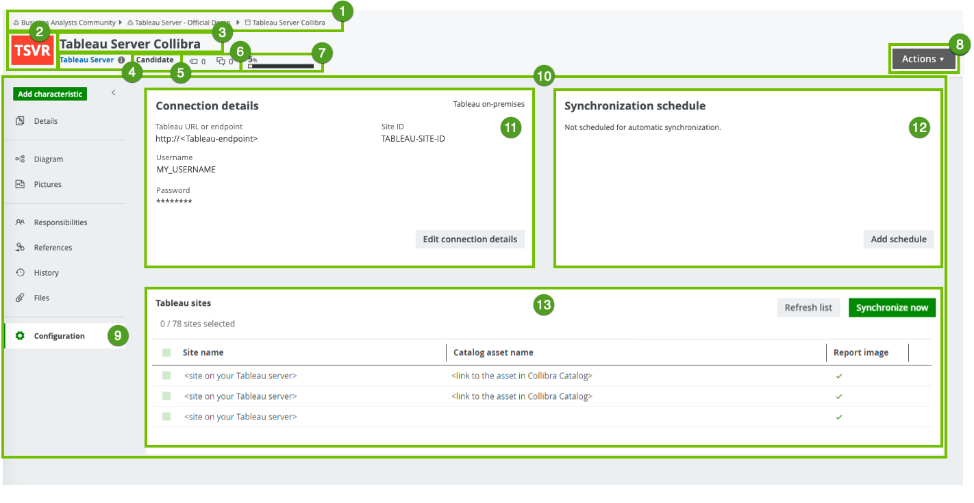 The currently selected page, in this case the Configuration page, which contains the Connection details section, the Synchronization section and Tableau sites found on server section of the Tableau Server asset. |