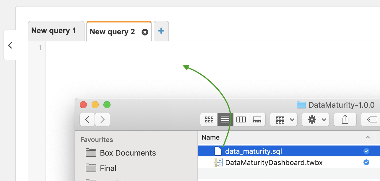 - In one of the report template package ZIP files you downloaded from Collibra Marketplace, drag and drop the SQL file into a new query tab.