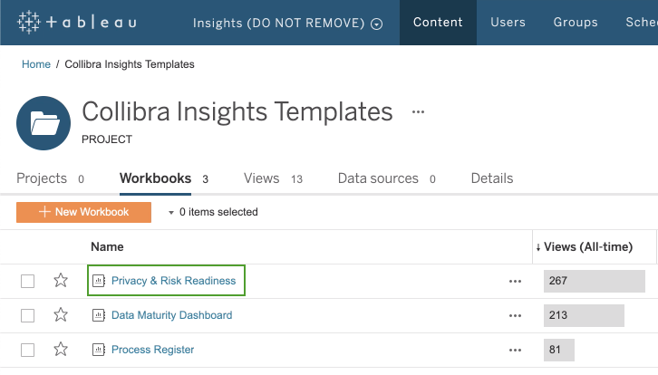 - On the Workbooks tab in Tableau, click one of the workbook files, for example Privacy & Risk Readiness.