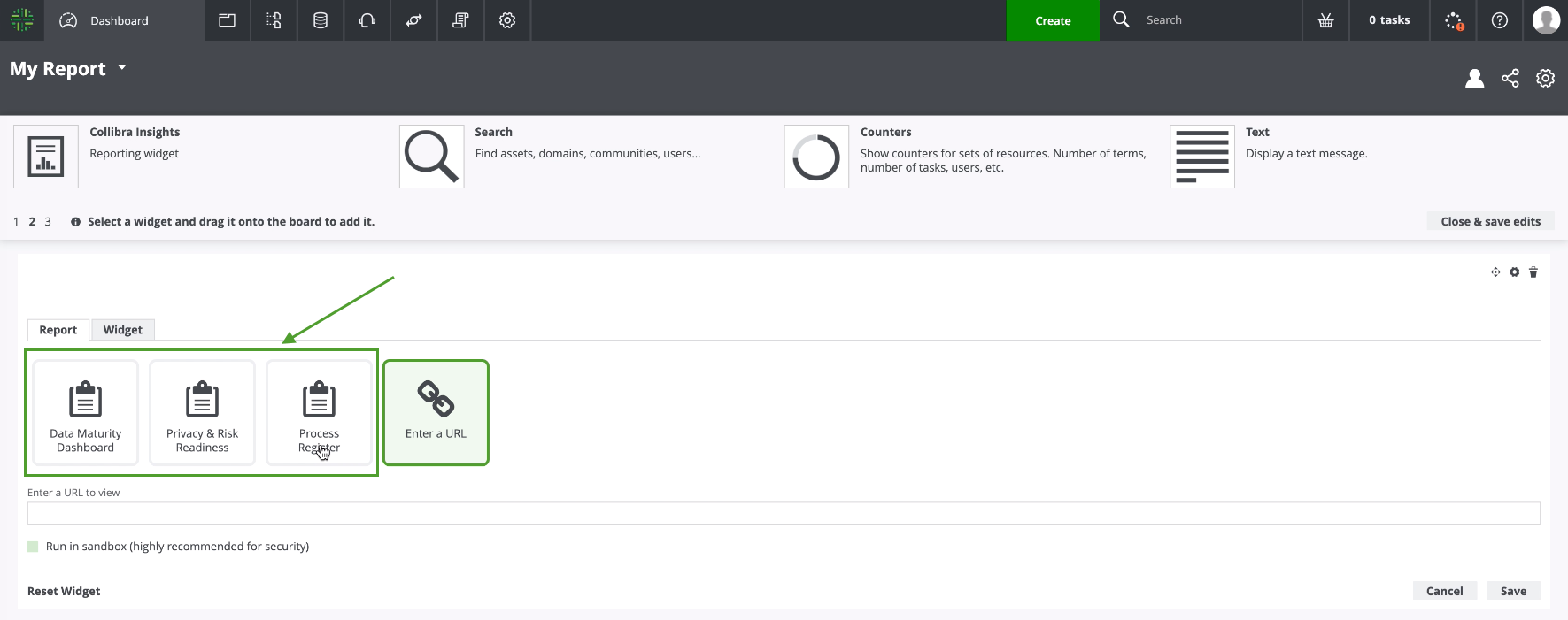 → Edit widgets. - Find the Collibra Insights widget and drag it onto the dashboard.