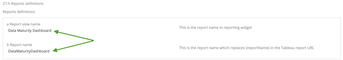 Tip Use the name as it appears in the URL of the Tableau report, for example "DataMaturityDashboard".