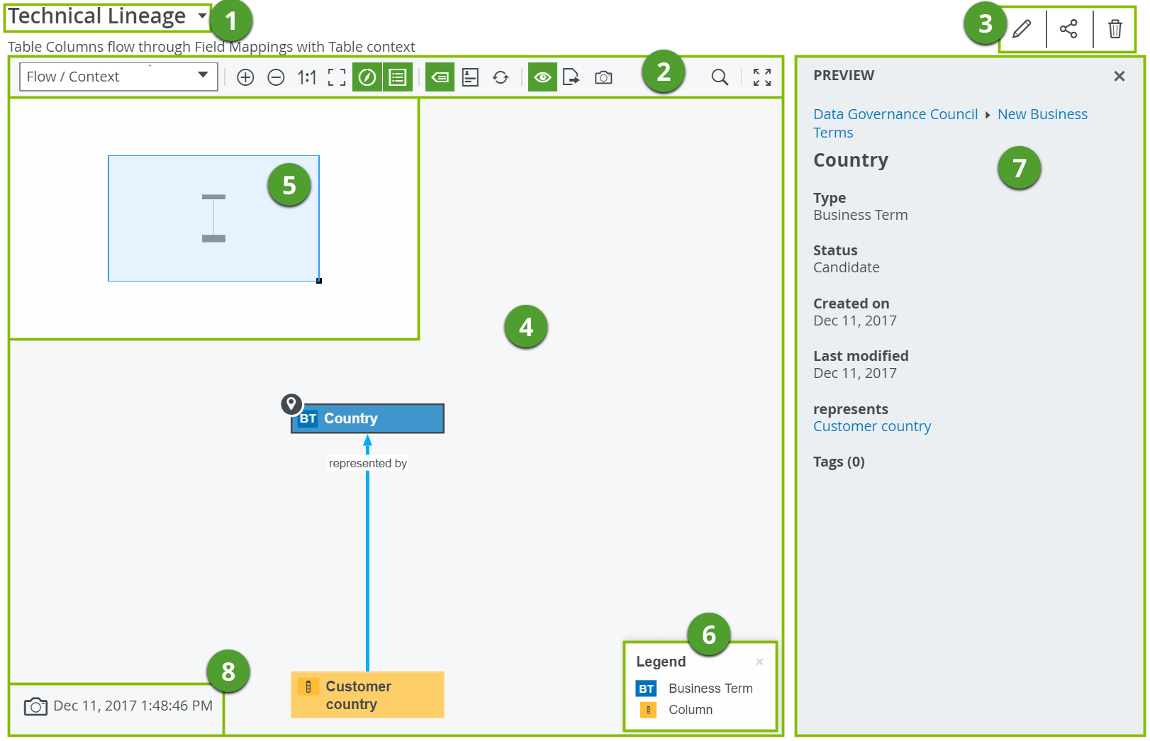 The legend explains the color codes and symbols of the items in the For each asset type and complex relation type that is visible on the If all occurrences of a given type are boxed inside collapsed boxing nodes, that type is not visible and therefore, not shown in the legend. Tip