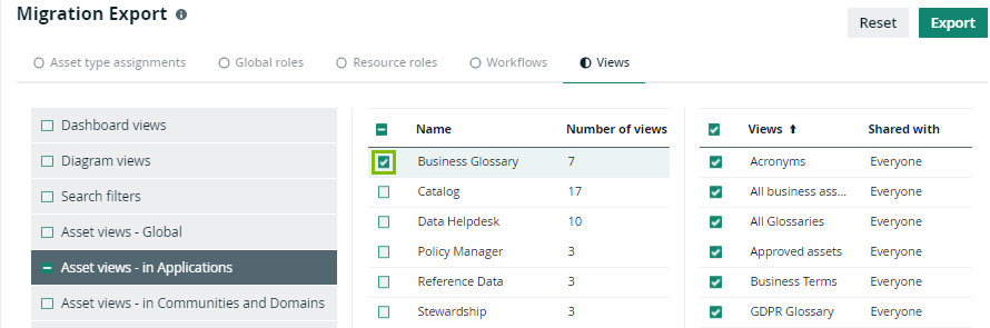 - If you want to export all available views in all application pages, select the checkbox in front of Asset views - in Applications in the filter pane.