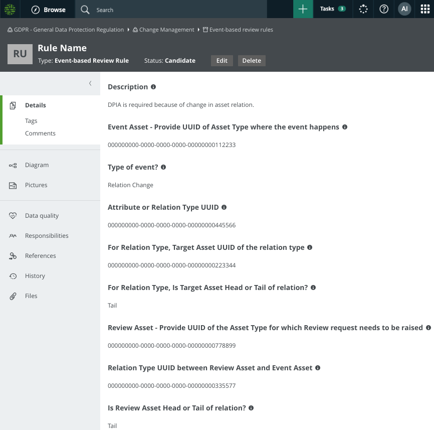 - Selected during the asset onboarding process, in which case a relation is created between the newly proposed asset and the Review Rule asset.