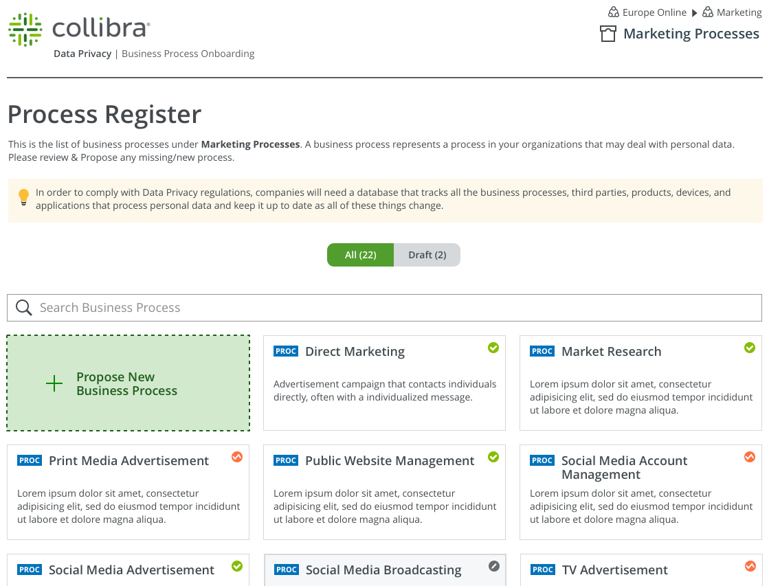 The Business User Interface is a webpage that shows all of the Business Process assets in a domain. It's an easy way for users that might not be familiar with the technical details of your privacy and risk program or Collibra Data Intelligence Cloud, to start describing their business processes and related data.