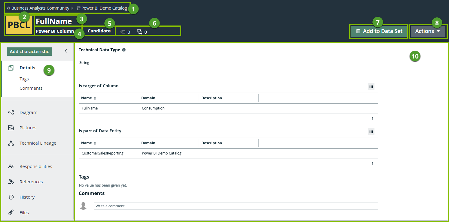 A collapsible pane that allows you to navigate to other pages of the Note You only see the Technical lineage tab if you have ingested Power BI metadata (cloud-only feature) and you have the Data Catalog and Technical lineage global permissions. |