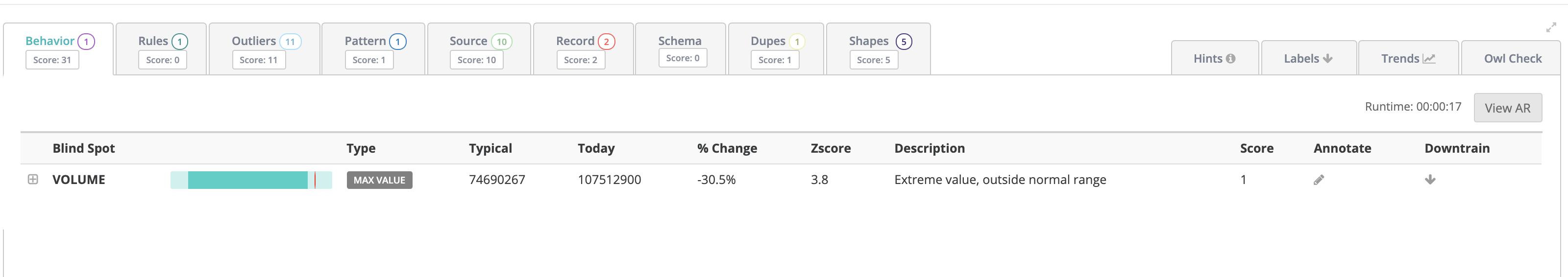 In adaptive mode Owl automatically generates a DQ item score based on the egregiousness of the line item. This measurement is directly proportional to the distance from the green range to the red line. Example below.