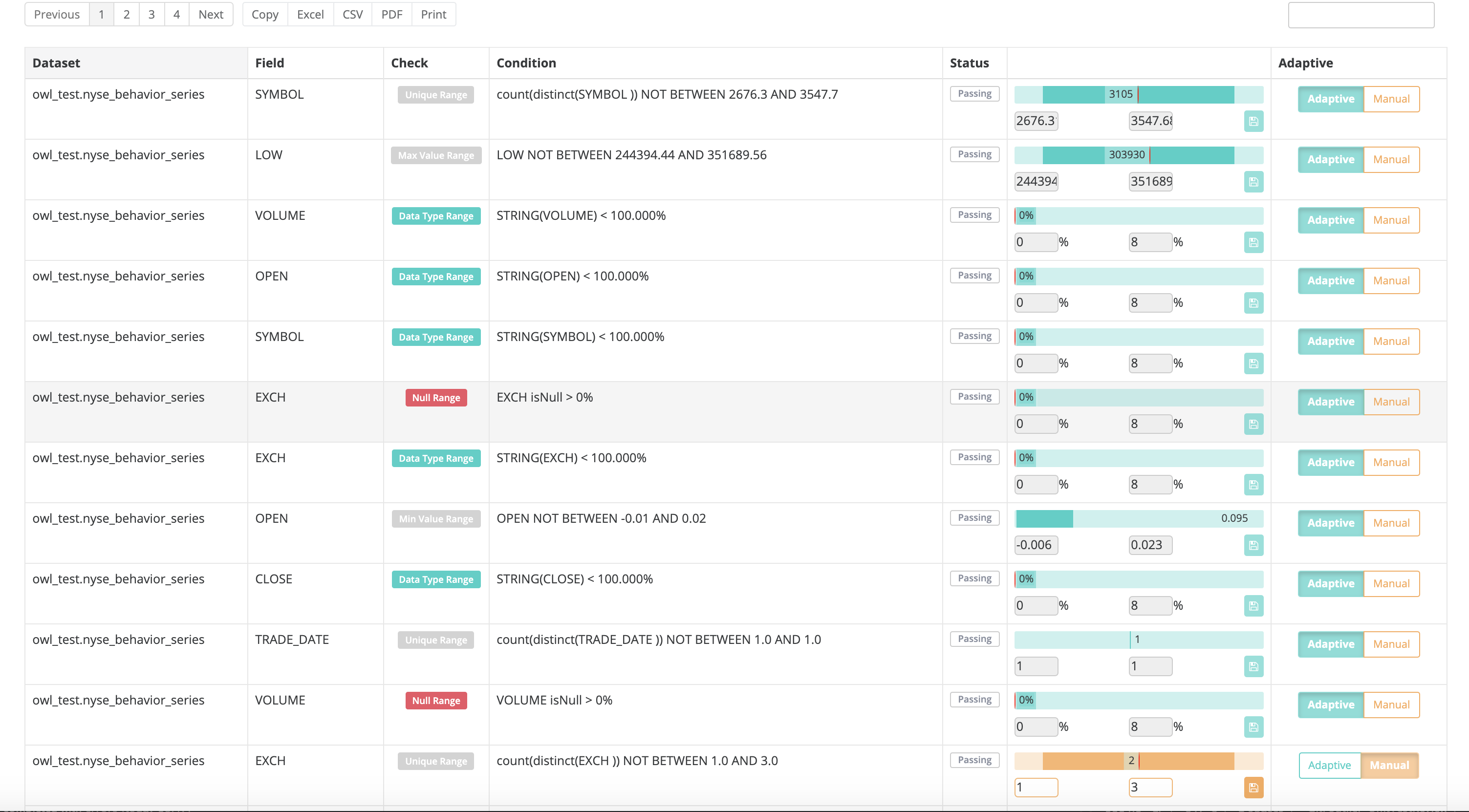 As Owl builds and evolves the behavioral model, it will expose all of the "Adaptive Rules" that it is learning about. The above example demonstrates how Owl learns and automatically applies rules. The user has control but if left alone, Owl will learn what what "Normal" means for a given dataset and score quality of that dataset accordingly. This will result in a large set of rules that are automatically applied and adapted as the dataset changes over time.